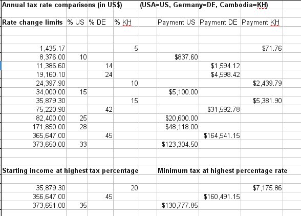 After these philosophical considerations about taxation, a comparison of actual tax rates in the USA, in Germany, and in Cambodia, can serve as material for reflection: how we evaluate these different taxation systems – especially the application of progressive tax rates by which the tax increases as the taxable base amount increases. And what we consider to be goals towards which to work.